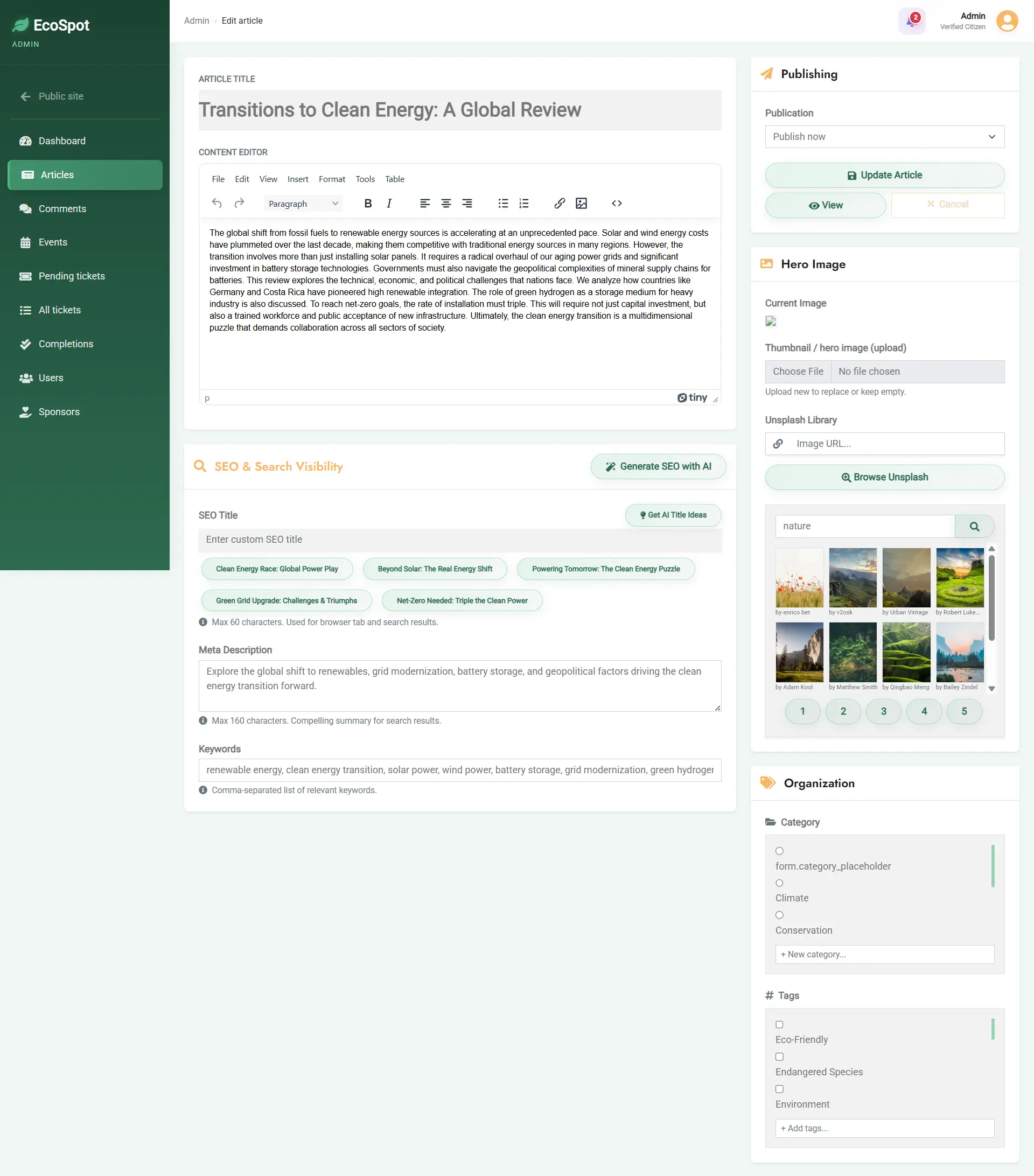- Rich Media Editing: Supported by the TinyMCE API and Unsplash API hook for users to browse and attach copyright-free images immediately while drafting.
